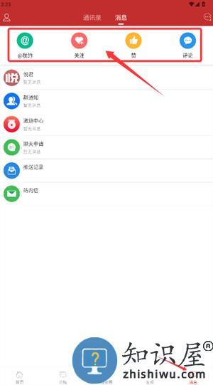 3、切换至消息页查看关注、点赞及评论等社交互动动态信息。