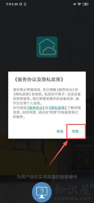 1、在智能硬件应用中点击"同意"服务协议,进入登录界面。