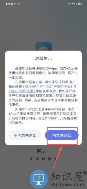 1、在格力+App中点击"同意并继续",进入设备管理界面。