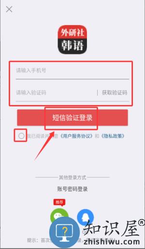 1、在外研社韩语App中点击"同意"服务条款,进入登录界面。
