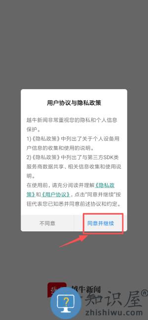 1、在越牛新闻中点击"同意并继续",进入功能引导页面。