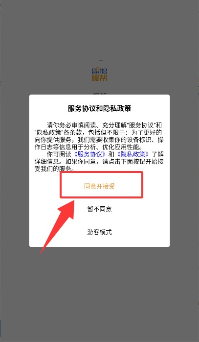 1、首次启动暖帮APP时,请在欢迎页面仔细阅读服务条款与隐私政策,确认无误后点击下方“同意并接受”按钮。