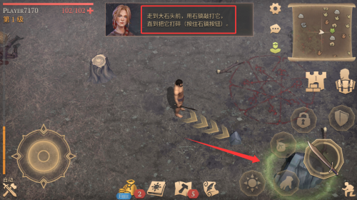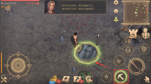1、靠近大石头,按住石镐按钮将其打碎。