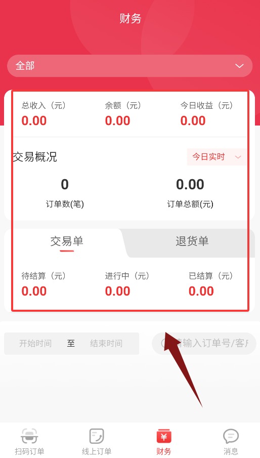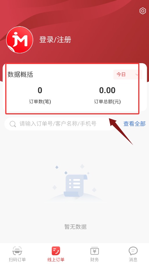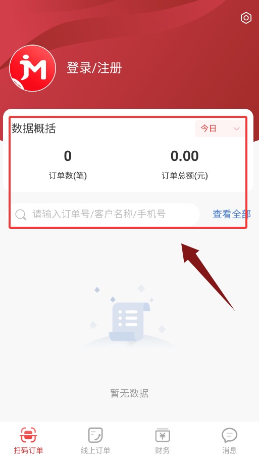 2、扫码订单界面可查看数据概括、订单数量与订单总额。