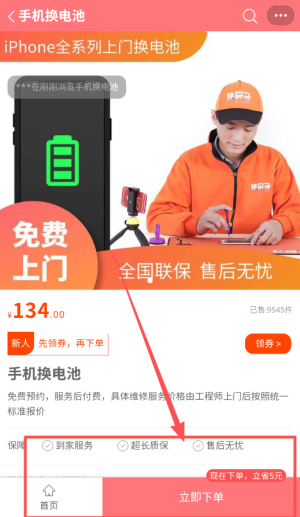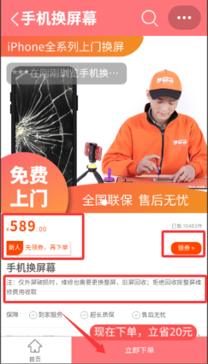3、选择手机换屏服务,领取优惠券后即可立即下单。