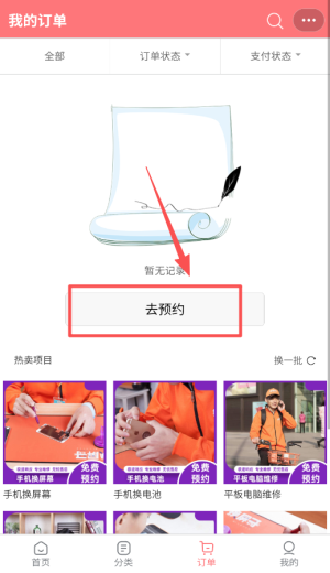 1、打开软件后先完成注册登录,在首页就能看到各种维修项目比如换屏,电池修复,选择你需要的服务类型。