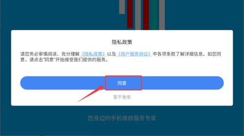 1、首次启动应用,请在隐私政策页面点击同意接受服务。