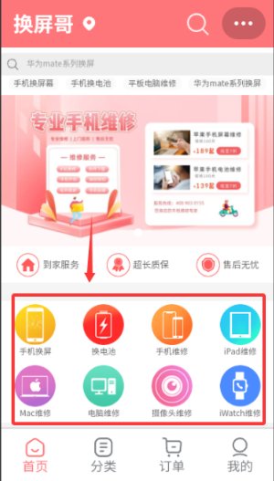 2、首页提供手机换屏、电池更换等多项维修服务选项。