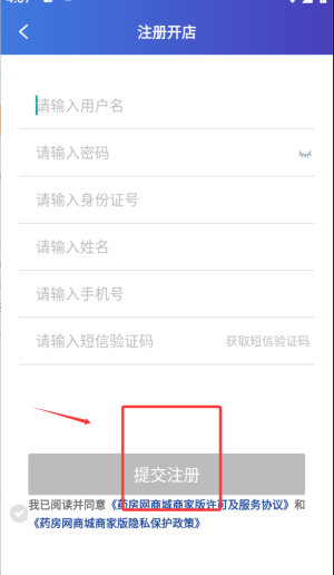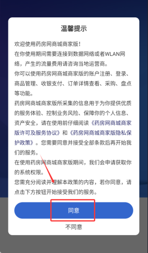 1、阅读并确认服务协议,点击进入药店注册功能主操作界面。