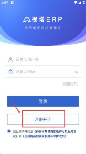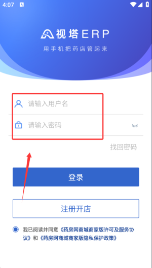 4、使用已注册账号完成登录流程,同步药店数据与权限设置。