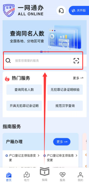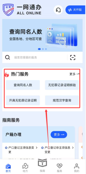 4、主页展示常用热门服务、同名人数查询以及无犯罪记录开具等政务服务功能。