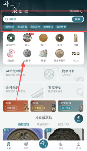 1、下载安装后打开斗泉先完成注册登录,随后浏览首页推荐的各类钱币藏品,可按年代或品类筛选感兴趣的内容,初步熟悉平台布局。
