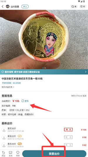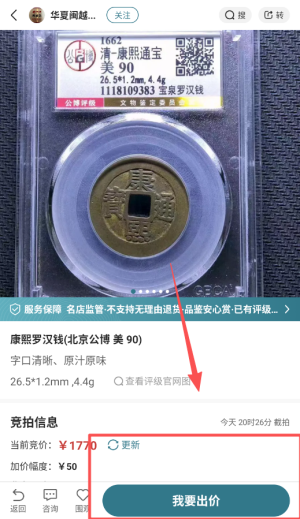 4、选定钱币后查看当前出价情况,并参与竞价或直接购买。