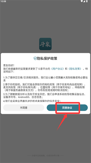 1、打开应用,仔细阅读用户协议与隐私政策后点击同意。