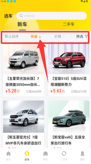 2、在选车页选择新车分类,筛选并查看车型详情。