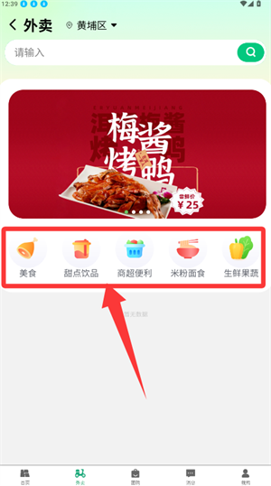 1、在首页功能区点击外卖选项,进入服务页面。