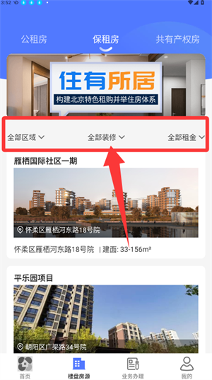 2、在保租房页面,通过区域或装修条件筛选项目。