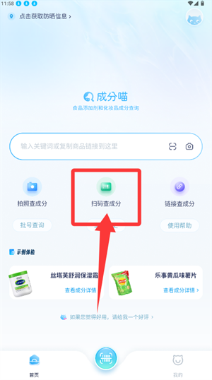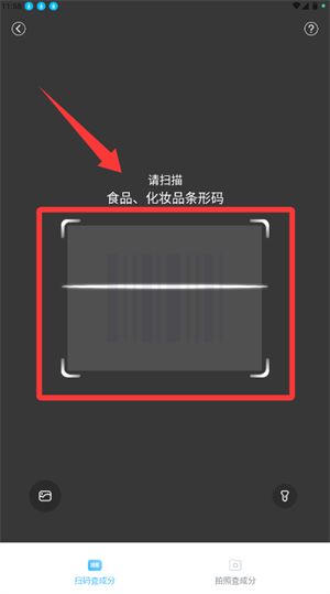 2、返回主界面后,选择扫码查成分功能进入识别页。