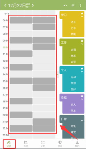 总结:通过文字、图片和录音来记录每个时段的点滴感悟。
