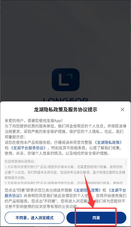 1、打开应用后阅读隐私政策与服务协议,点击同意进入登录界面。