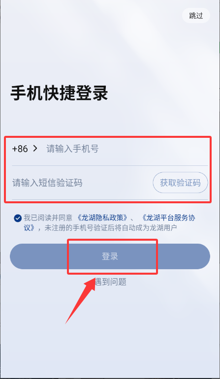2、在快捷登录页填写手机号并获取验证码,填入后点击登录。