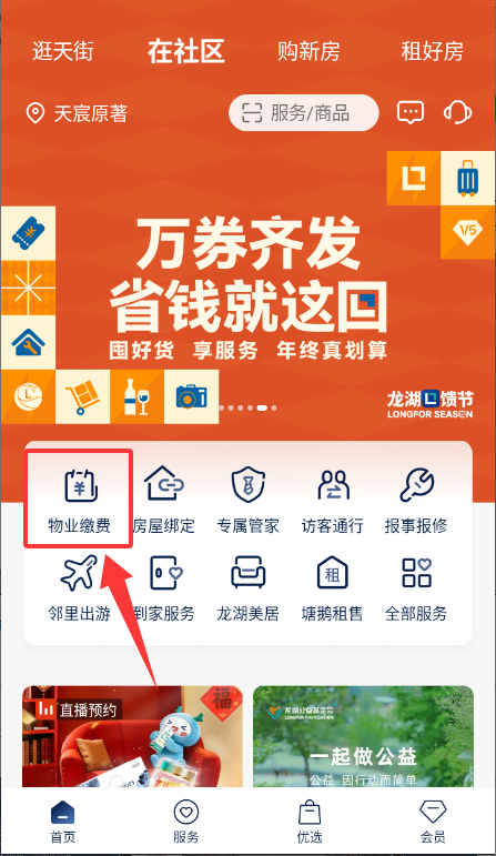 在首页,可以看到物业缴费、邀请亲友、访客通行、手机开门等多个功能!