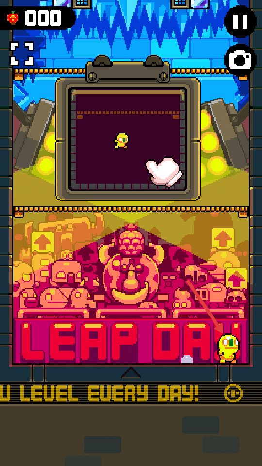 如果你曾经是个 Flash 游戏爱好者或像素游戏迷,或许听说过 Nitrome 的大名.这家位于伦敦的独立游戏工作室自 Flash 时代便以极为精巧的像素画风闻名,而 Leap Day 也没有背离他们的一贯风格,独特的艺术效果令其在一众大作间脱颖而出.同时,Leap Day 的背景故事也颇具黑色幽默,每日伊始,你会在聚光灯及观众欢呼声中登场;而上到第2个小场景,会有两名观众正在收看明天的节目预告;如果当天正好是现代都市场景,你甚至能在背景中看到无数电视台的24小时转播直升机--没错,你所有的冒险都只不过是一场真人秀节目,你被激光扫过、被巨石冲击、一次次死去又一次次复生,所经受的一切却只不过是观众茶余饭后的谈资.从这种意义上讲,无法反抗的你甚至比楚门更加无助.