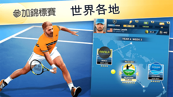 参加比赛:训练完成后,可以报名参加各种国际比赛,如职业网球巡回赛、联赛、锦标赛等,争夺榜前排名。