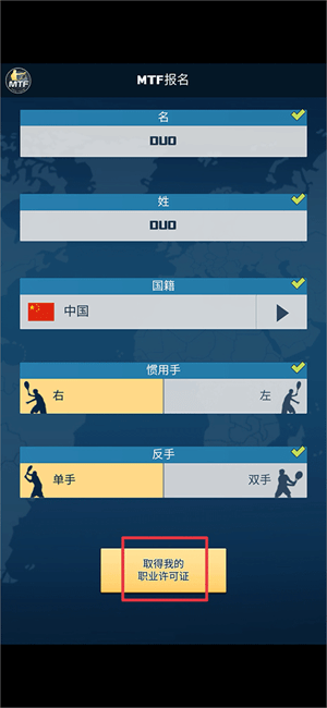 进入游戏后,首先将姓名,国籍,惯用手信息完善后即可取得职业许可证