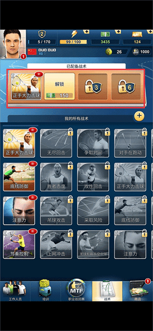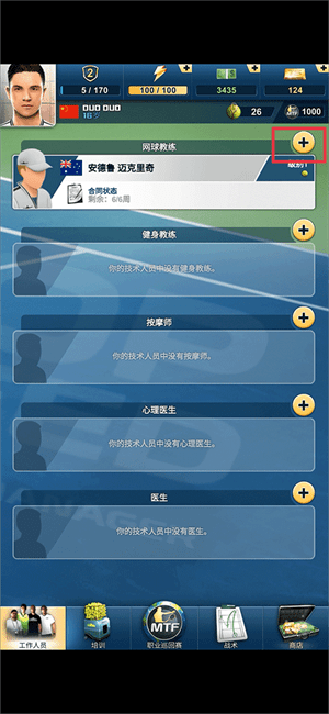 组建教练团队:在工作人员界面中建立教练团队,包括网球教练、健身教练、按摩师、心理医生等,以扩建职业团队。