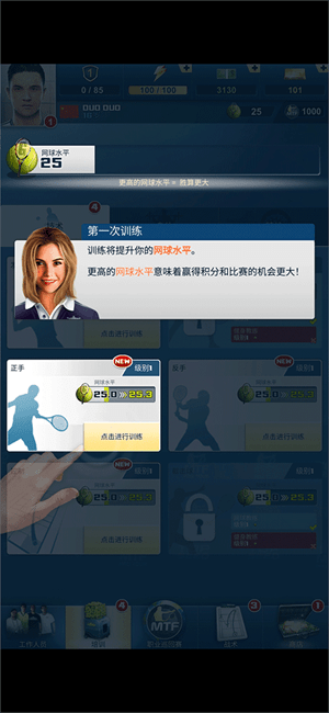 有了教练后,你就可以进行网球训练来提升水平,只有更高的网球水平才能有更大机会获得比赛的胜利
