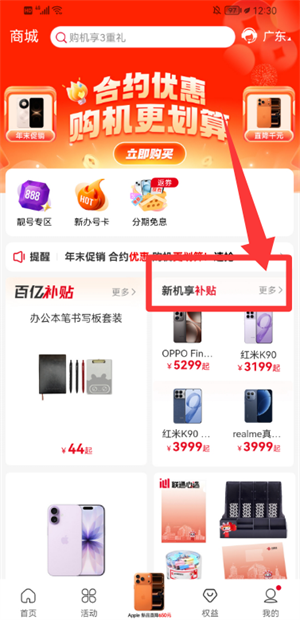 1、从商城页面进入新机享补贴区域,浏览相关商品列表。