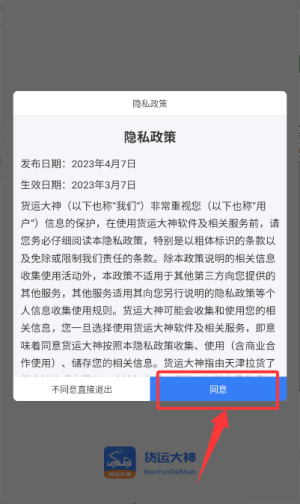 1、打开应用后在隐私政策弹窗内点击红色同意按钮,进入后续流程。