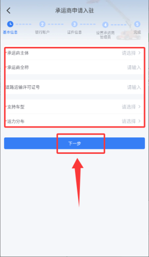 2、进入承运商申请入驻页填写主体信息后,点击红色下一步按钮。